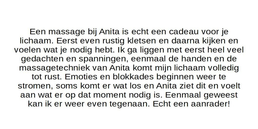Ik ben Anita Broersen en gelukkige eigenaar van massagepraktijk In het Nu en tot voor kort vele tientallen jaren werkzaam in de zorg, waarbij ik een bijdrage mocht leveren aan het dagelijks leven van mensen met dementie binnen het verpleeghuis. Het stukje 'zorgen voor' is een groot onderdeel van mijn leven. Waarbij ik mij vanuit warme betrokkenheid en oprechte interesse graag de verbinding met de ander aan ga.