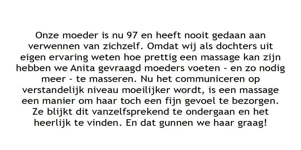 Respectvolle massage afgestemd op jou, of jouw dierbare, zorgt voor diepe ontspanning. Altijd rekening houdend met wat (fysiek) mogelijk is.